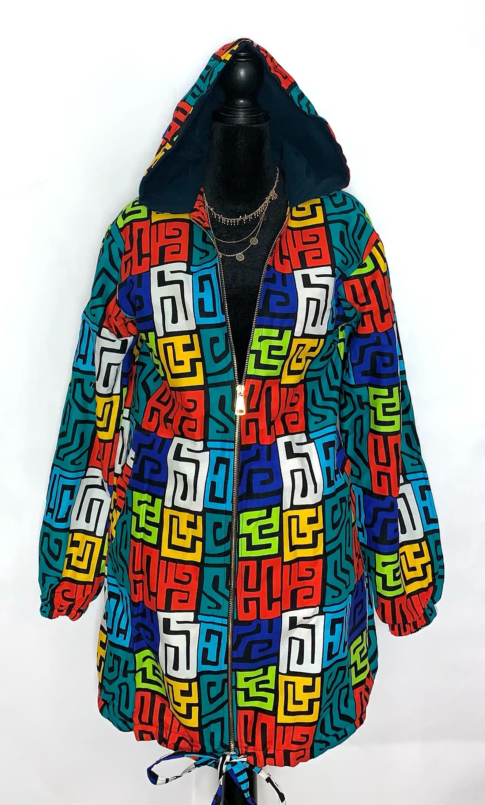 African Print Jacket with pockets and a drawstring at the bottom of the jacket. 100% Cotton. Warm and Stylish!